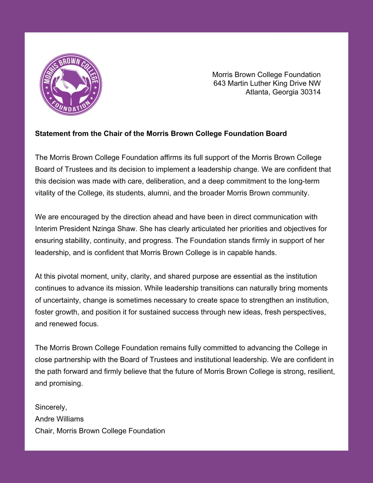 Our mission is to serve as the business arm of Morris Brown College, forming and fostering public and private professional relationships, providing fiduciary responsibility for all foundation resources and delivering ongoing support for the educational and cultural goals of Morris Brown College and the surrounding communities.